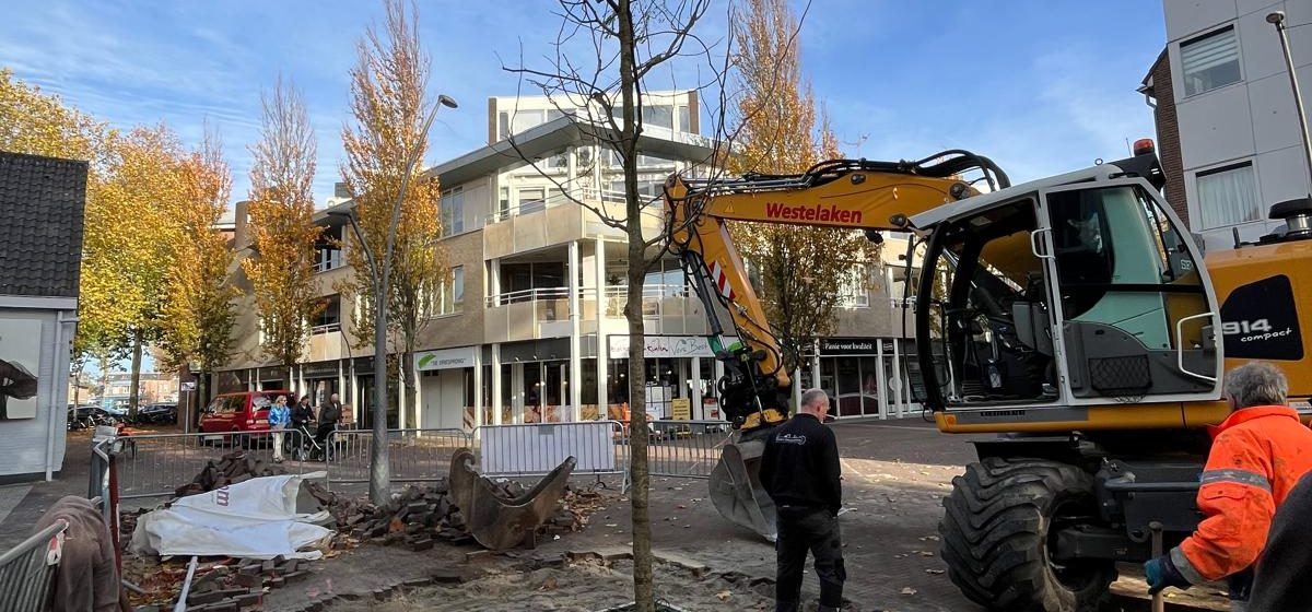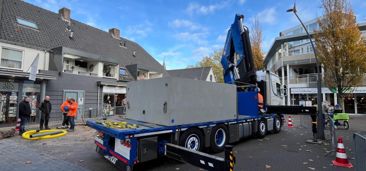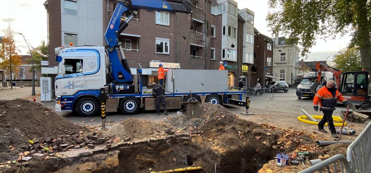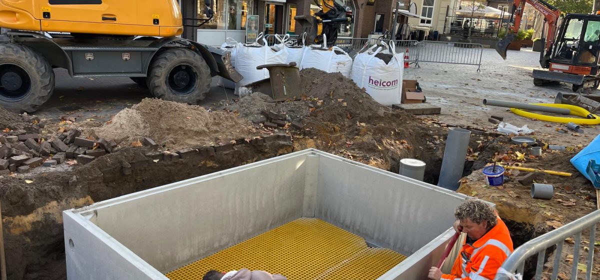 Het marktplein bleek een uitdagende locatie voor extra bomen. Onder de verharding ligt een complexe wirwar van riool-, data-, gas-, water- en elektraleidingen. Tijdens zorgvuldig uitgevoerde proefsleuven werd een beschikbare ruimte van circa 2,5 bij 3,5 meter ontdekt. Op de foto’s is te zien hoe dicht de betonnen groeibak uiteindelijk bij de bestaande leidingen is geplaatst. Normaal gesproken kan een boom op een dergelijke plek niet in de volle grond worden geplant, omdat de wortels schade kunnen veroorzaken. Volgens de richtlijnen moet een boom minimaal twee meter van kabels en leidingen verwijderd blijven.